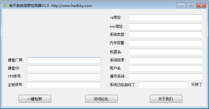 一键获取的系统信息包括:oemlogo图片、操作系统、硬盘厂商、硬盘id、cpu序列号、主板序列号、ip地址、mac地址、系统类型、内存容量、机器名、系统目录、当前用户和计算机已经启动的时间(分钟)