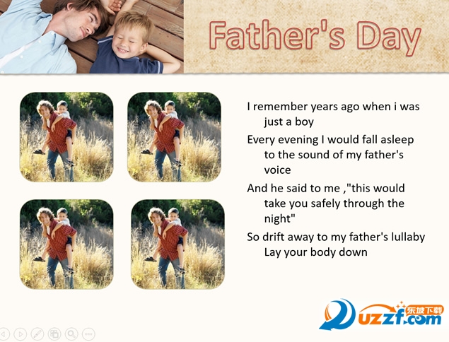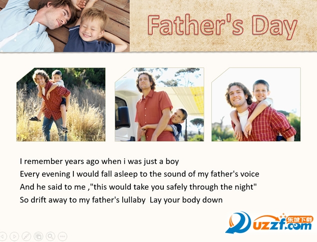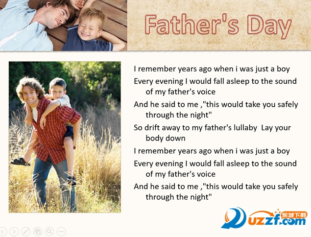 享受父爱沐浴阳光父亲节ppt是一份温馨的父亲节ppt模板,父子躺在地板上,父亲微笑的看着孩子,孩子开心的沐浴着阳光享受着父爱,需要的朋友可以免费下载使用。