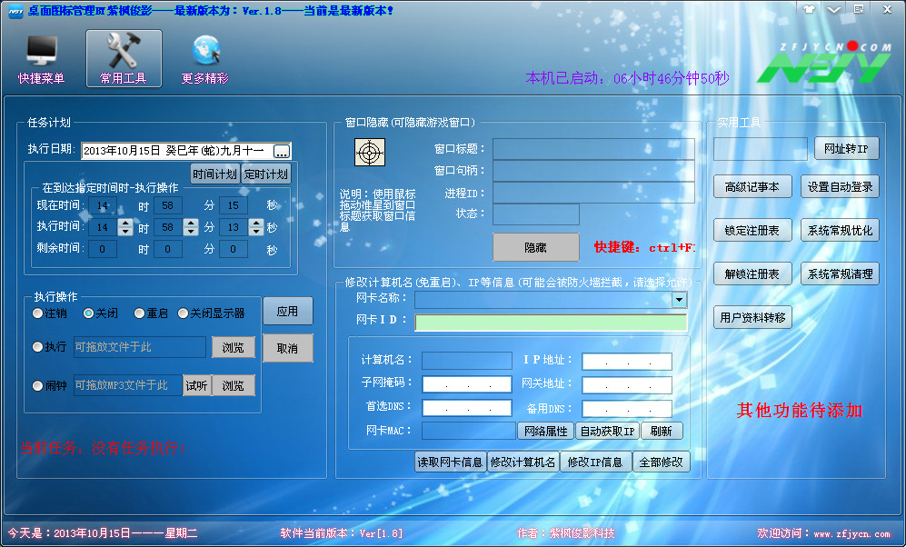 定时计划、窗口隐藏、网址转IP、高级记事本、锁定注册表、修改计算机IP、系统常规优化、系统常规清理等