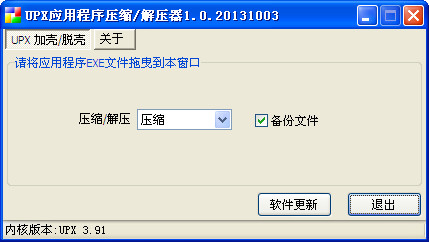 打开upx应用程序压缩解压工具,选择好压缩还是解压,然后将应用程序EXE文件拖曳到本窗口,软件默认会自动备份文件,你也可以选择不备份。
