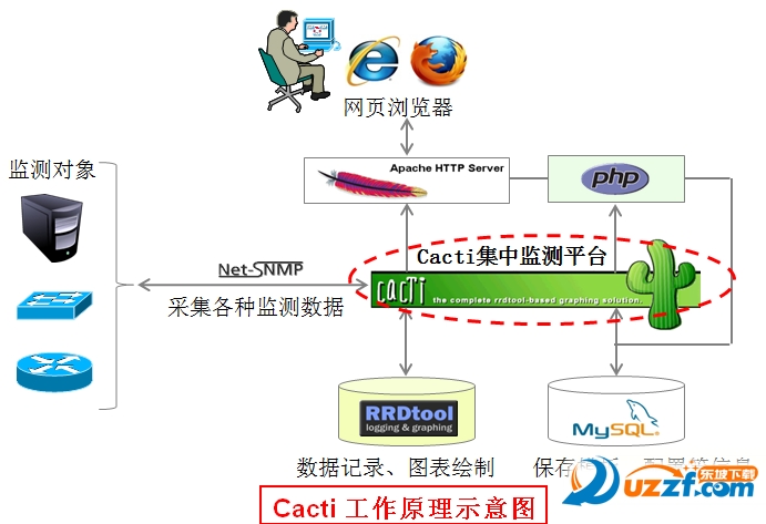 Cacti 本身只是一个web界面的管理套件,通过调用Net-SNMP工具来采集监测数据,并结合RRDtool (Round Robin Database Tool ,轮询数据库工具)记录数据并绘制图片,最终以web页面的形式展现给管理员用户。