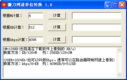 镰刀网速单位转换工具可以帮助你根据M、KB、kbps计算出详细的网速单位换算,操作简单,功能一目了然,非常方便快捷。