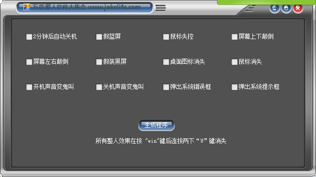 自动关机,假蓝屏,鼠标失控,屏幕颠倒,假装黑屏,图标消失,鼠标消失,开关机声音变鬼叫,弹出错误框