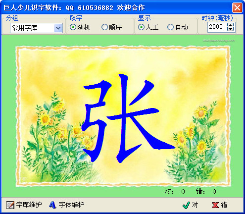 打开巨人少儿识字软件后,单击界面可以换字,你可以自由选择分组字库,取字模式有随机和顺序两种,可以选择人工或手动显字。还具有字库维护、字体维护的功能。