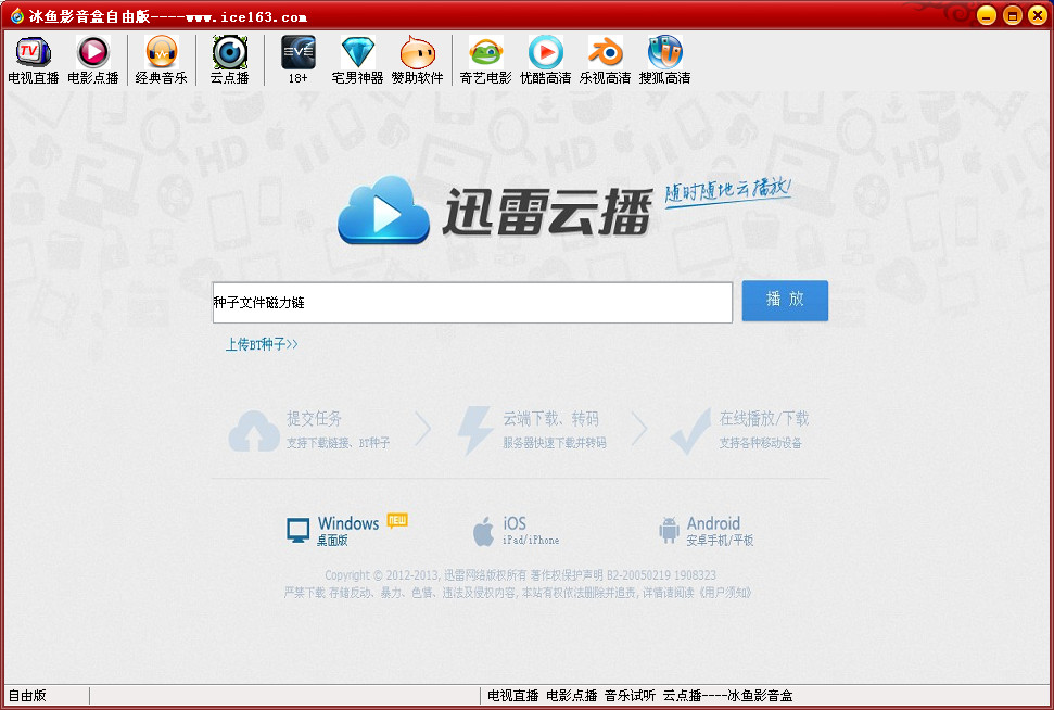 冰鱼影音盒自由版是一款在线影音播放器软件,绿色免费,由网友破解重制,突破限制,让你可以自由观看,非常随心所欲,为你提供迅雷云点播、电影电视在线看等功能,让你方便快捷的享受流畅的影音播放感受,非常实用。