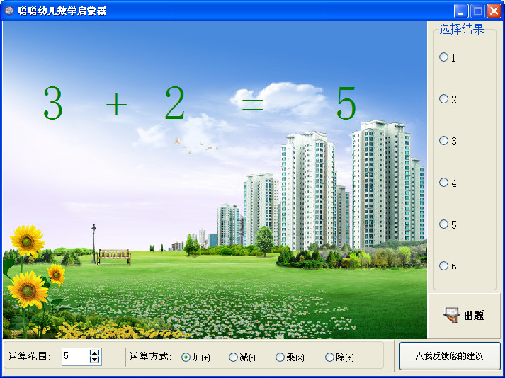 聪聪幼儿数学启蒙器操作非常简单,右键解压后,打开软件,最下方可以选择数字运算范围、加法、减法、乘法、除法!点击 出题 按钮,屏幕中间就会出现相应范围内的数学运算题,幼儿计算后,可以在右侧备选答案中选择正确选项!