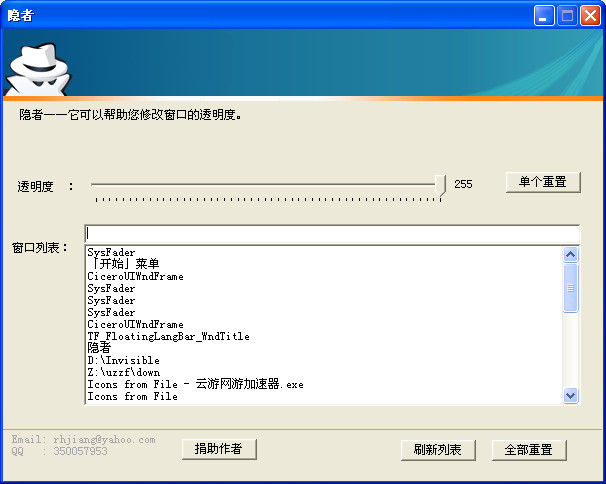 打开隐者修改窗口透明度工具后,会自动读取窗口列表,选中要修改的窗口,拖动透明度修改条就能直接修改了。