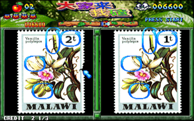 曾经在街机游戏厅非常经典的找茬游戏,可以一个币和很多朋友一起来玩这个游戏,基本上可以玩很少时间,是大家一起娱乐休闲的放松方式之一。