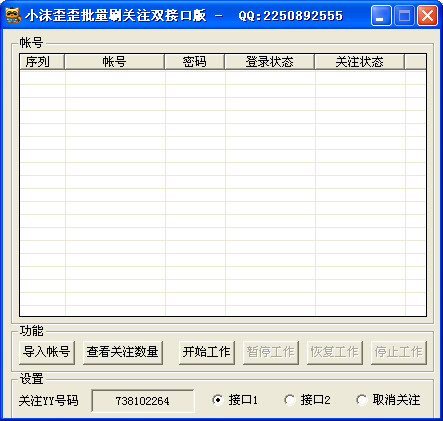 打开小沫歪歪批量刷关注双接口版,导入账号,点击“开始工作”。有接口1和接口2以供选择。