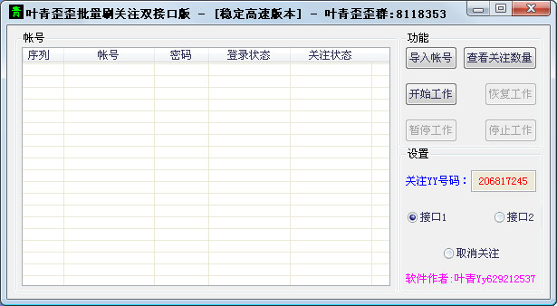 叶青歪歪批量刷关注双接口版是一款稳定高速的YY刷关注软件,绿色免费,使用双接口来进行刷YY关注,非常稳定高效,简单易用,让你快速提升YY人气,轻松成为YY红人!