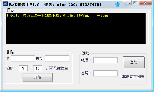 打开现代搬砖工,登陆贴吧账号,输入帖子的ID,从哪里搬到哪里,这两个贴的ID都要写,再点击“开始”按钮,还可以自由设置延时,选择是否只搬楼主。
