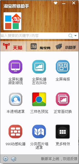 淘宝装修助手帮助淘宝卖家更加轻松方便的装修店铺,对普通用户全面开放,完全绿色免费,功能十分强大,拥有40多种特效功能,不断更新完善,让用户不再有后顾之忧,操作简单方便,绝对是装修必备的软件,帮助您解决店铺设计的烦恼。
