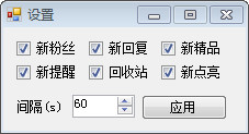 对新粉丝、新回复、新精品、新提醒、回收站、新点亮等进行动态提醒,带保存cookie功能,所有信息提示都在托盘气泡,托盘图标右键,可以设置提醒项目及间隔,默认60s。