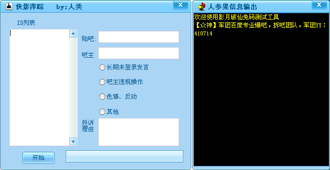 打开投诉机,输入要投诉的贴吧名、吧主名、投诉理由,可以选择长期未登录发言、吧主违规操作、色情反动、其他等。支持批量投诉。点击“开始”按钮进行投诉。