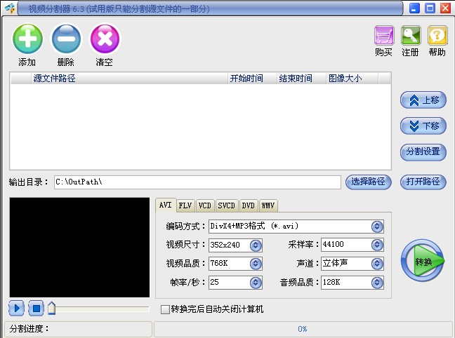 视频分割器是一款功能强大的视频分割工具,它可以帮助您将几乎所有流行的视频格式,如:RM、RMVB、VOB、DAT、VCD、DVD、SVCD、ASF、MOV、QT、MPEG、WMV、 MP4、3GP、DivX、XviD、AVI、FLV、MKV等视频文件按您的要求分割成小的视频文件,可以输出FLV、AVI、VCD、SVCD、DVD、WMV等多种视频格式。支持多个文件批量分割。