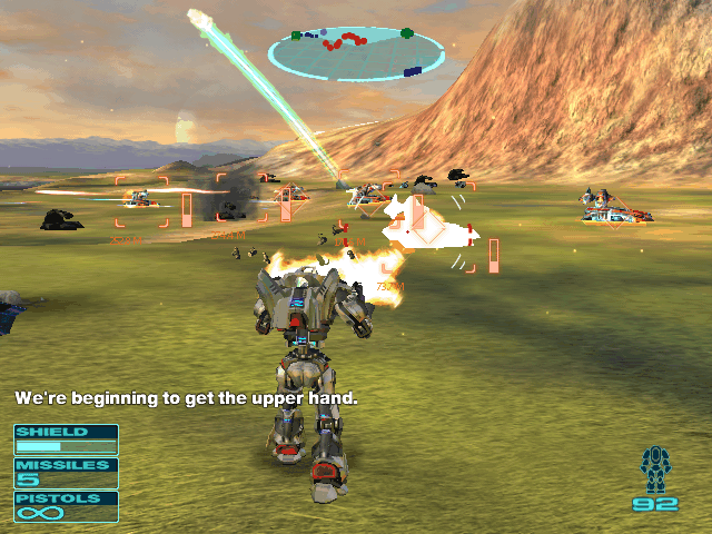游戏中,玩家所控制的机甲拥有机器人和战斗机两种形态,它们互相变换时的动作非常细腻,即便是在交战中也给人行云流水的感觉。其中,当变形为战斗机时机甲将拥有强大的空中火力和飞行速度,适合与敌方的空中部队战斗;而当目标是摧毁敌人基地这样的对地攻击任务时,则可以转化为机器人战斗模式,以加强对地攻击的火力。另外,每种形态的机甲都将拥有四种攻击方式。虽然武器是根据关卡逐一提供给玩家的,但是默认难度下第一种武器是没有子弹限制的。