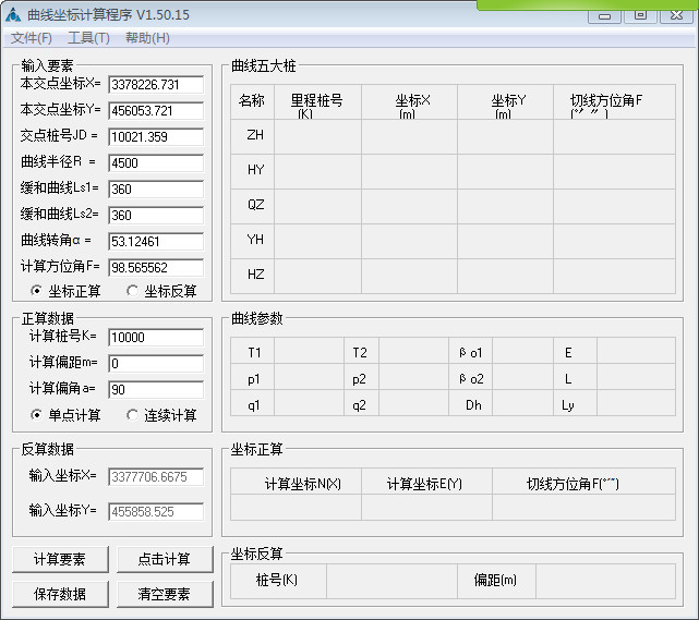2、附有正算、反算功能,正算:通过里程和偏距计算坐标,反算:通过坐标反推里程和偏距。
