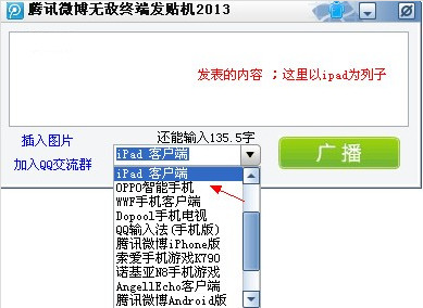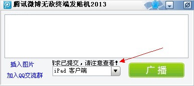 腾讯微博无敌终端发帖机可模拟多个终端发送腾讯微博,支持发表ipad QQ微博广播等14种方式,操作简单方便,绿色免费,需要开通微博才能使用,还等什么,快来试试吧!