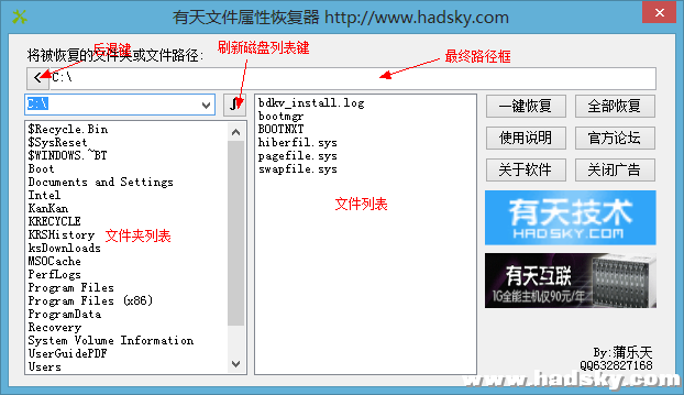 有天文件属性恢复器,主要针对中了U盘病毒的用户,用此软件可以恢复被隐藏了的文件或文件夹。本软件的功能是将所选定的文件或文件夹取消隐藏属性,取消只读属性,取消系统文件保护属性。