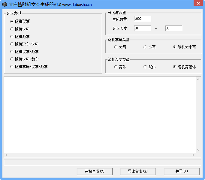 大白鲨随机文本生成器,能够根据你的选择生成指定类型的随机文本,文本数量和文本长度可以自己定义。