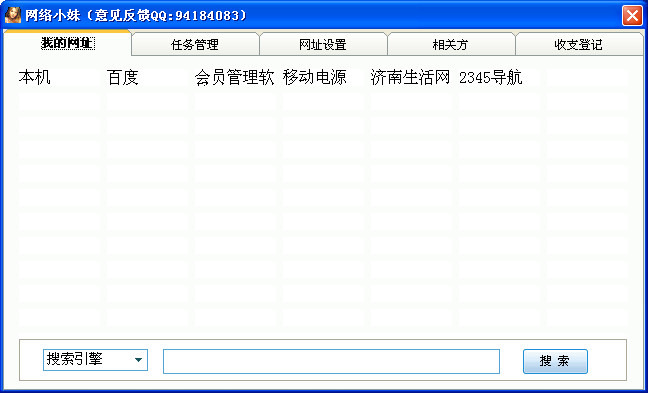 软件带悬浮框口,右键点击,即可弹出应用程序设置好的网址,再次点击自动关闭;软件同时集成各类搜索引擎,让上网更轻松;不用再通过在地址栏输入,同时程序带备份功能,一次设置好网址,长久使用;同时可以分享网址;同时程序加入了任务管理、相关方登记和收支登记,方便日常工作管理。