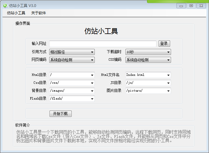 仿站小工具是一个下载网页的小工具,能够自动检测网页编码,远程下载网页,同时支持同域名和跨域名下载Css文件(导入Css文件)、Js文件、Flash文件,并能够从网页和Css文件中分析出图片和背景图片文件下载到本地,实现不同文件按相对路径实现归档的小工具。