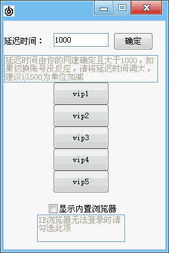 2、然后延迟时间可以自由设置,延迟时间由你的网速确定且大于1000,如果切换账号没反应,请将延迟时间调大,建议以500为单位加减。可以勾选“显示内置浏览器”