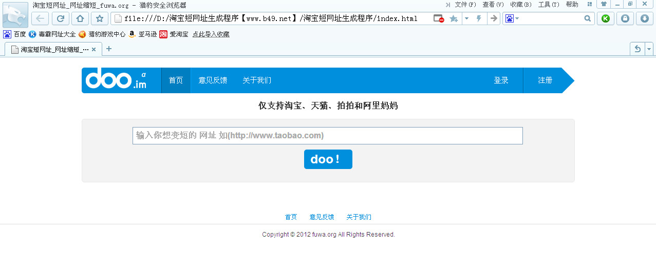 这是一个淘宝短网址生成程序源码,仅支持淘宝、天猫、拍拍和阿里妈妈,帮助新手更加方便快捷的建站,学习网页设计的朋友也一定会喜欢,网页模板非常简洁大气。