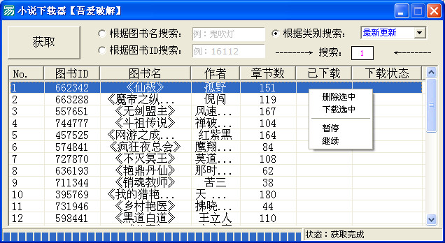 打开软件,选择搜索条件,根据图书名搜索、根据图书ID搜索、根据类别搜索,然后点击“获取”即可。