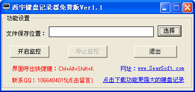 本软件能够将计算机用户的键盘输入及汉字输入全部记录下来。适用于所有应用程序,如QQ,MSN,Skype,word,Excel,记事本,写字板,IE网页等任何键盘输入程序。广泛用于家长对孩子的管教和企业对员工的监督,计算机教室,网吧的监控与管理。作者提醒:用户输入的帐号密码能记录下来,请勿将此软件用于非法用途。使用说明 1 首先运行本目录下的keyboardlog.exe,然后点"开起监控",注意这个程序只要运行一次就可以了,以后开机的时候自动运行。 2 如果不想运行这个程序,请执行"停止监控".