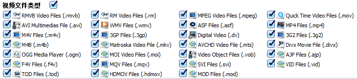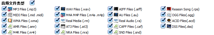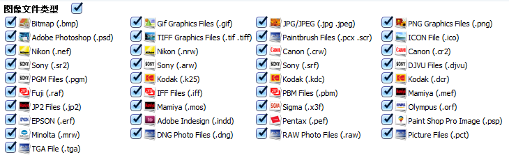 高级扫描选项里面列出了所有支持恢复的文件格式,如果你只想恢复其中的某些格式的文件,请只选择对应的文件格式,这将大大提高搜索速度