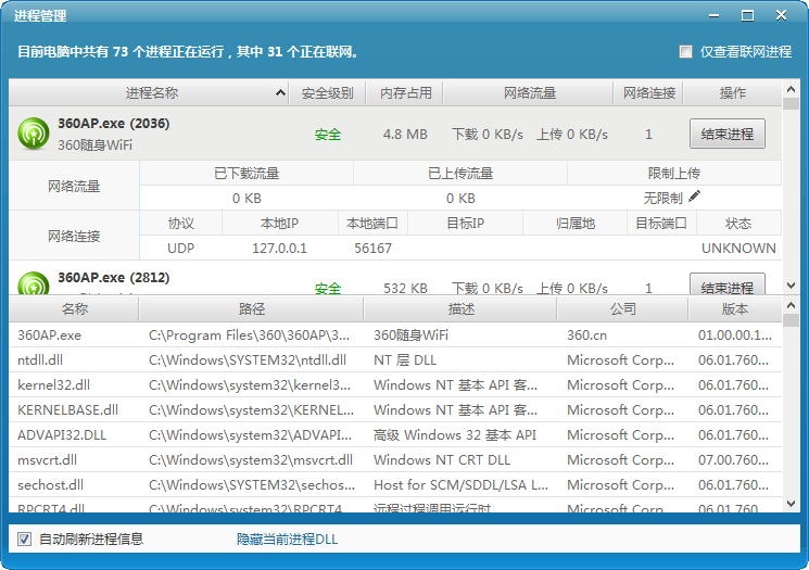 这是从瑞星杀毒软件中提取出来的一个系统进程管理器,相比Windows系统自带的任务管理器,这个软件功能更强大。不仅可以快速结束进程,查看进程路径,还支查看当前的DLL。