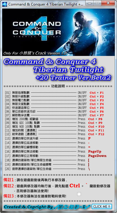 [01] 无限指挥点数 - 生產单位所需点数最大 - 开啟/关闭 = Ctrl + F1[02] 无限升级点数 - 科技升级保持9点数不减 - 开啟/关闭 = Ctrl + F2