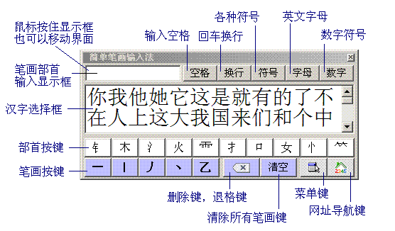 3.笔画键:包含“一、丨、丿、丶、”五个基本笔画。按书写顺序输入笔画即可输入汉字。