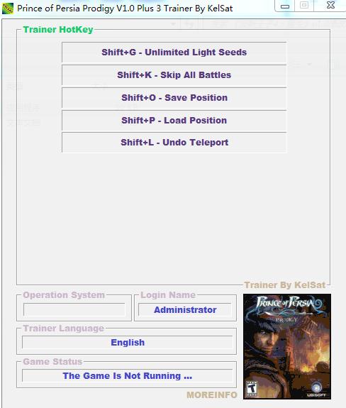 修改器语言选择请鼠标左击“Trainer By KelSat”标签,然后可以左击“MOREINFO”标签可以查看更多使用方法信息。