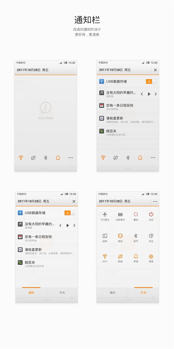 MIUI V4为什么会如此受欢迎,不仅因为这是国人自主开发的,更因为MIUI V4出色的界面设计,小编自己非常喜欢MIUI简介清爽的界面,同时对于任务管理菜单,下拉菜单的设计都是很科学的。