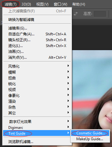 2、启动Photoshop程序,打开你的照片,在滤镜菜单中调用Cosmetic Guide滤镜即可!