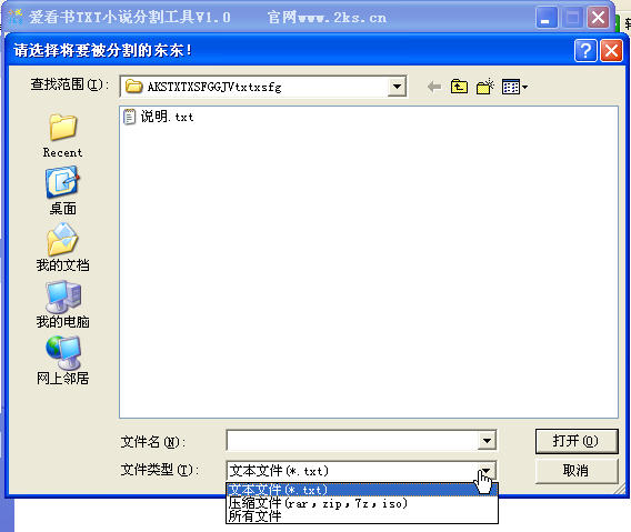 爱看书TXT小说分割器主要支持txt,zip,rar.iso,7z这些文件类型的切割。