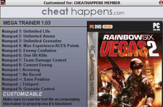此款修改器对应游戏彩虹六号:维加斯2版本为v1.03,为大家有提供了十二项实用修改功能,方便进行游戏,下载后直接解压即可。