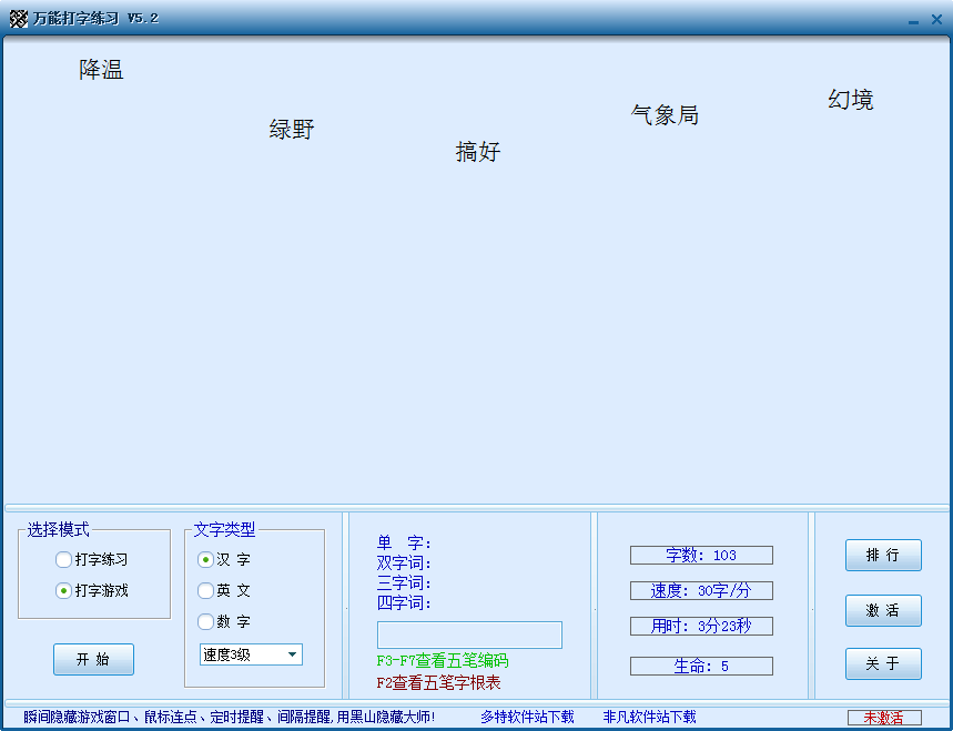 2、软件包含打字练习与打字游戏两大部分。打字练习提供汉字单字及词组练习、英文单词练习、数字练习,采用随机方式提取字库中的单字与词组进行组合,提供实时帮助,遇到不会打的字,按一下F1就会显示当前字及当前词的五笔编码(信息从一种形式或格式转换为另一种形式的过程)。