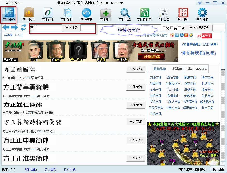 打开字体管家后,你可以搜索你需要的字体,有两个搜索框,选择左边那个!也可以到字体中心选择字体下载!