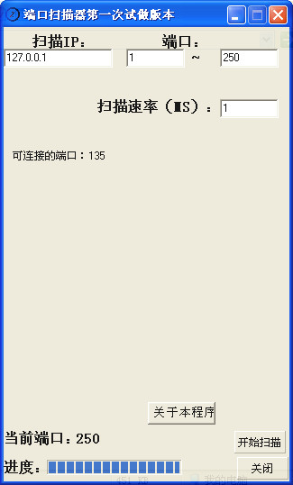 这是一款由网友编写的最新端口扫描工具,目前功能还不是很完善,不过扫描端口非常方便,速度也很快哦,需要手动输入扫描IP和要扫描的端口以及扫描速率。