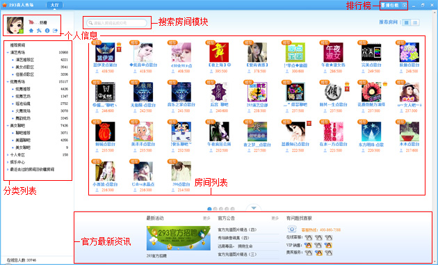 聊天室大厅包含有个人信息、搜索房间模块、排行榜、分类列表、房间列表及官方最新资讯。