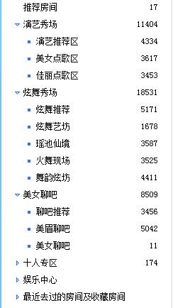 类列表包括演艺秀场、炫舞秀场、美女聊吧、十人专区、娱乐中心、最近去过的房间及收藏房间。