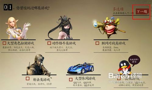 回答一系列的问题,即可顺利的提交内测资格申请。问题如下。第一题,问玩家是否有游戏经验,为多选题,选择之后,单击右上角的“下一题”: