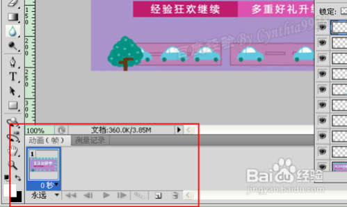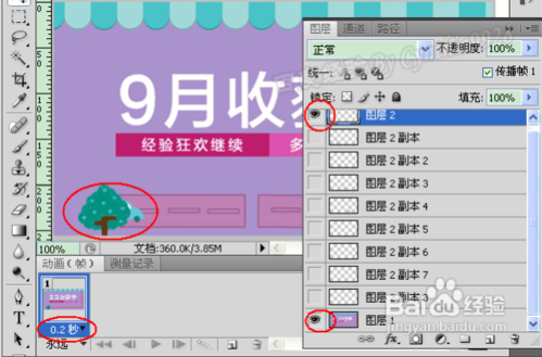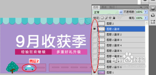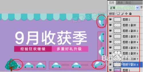 1、打开photoshop后,将需要成为动画的部分分图层制作出来。如图中所示,图层2是绿色小汽车,也是我们要制作成动画的唯一一个活动的组件,所以我们根据需要直接复制多个该图层:
