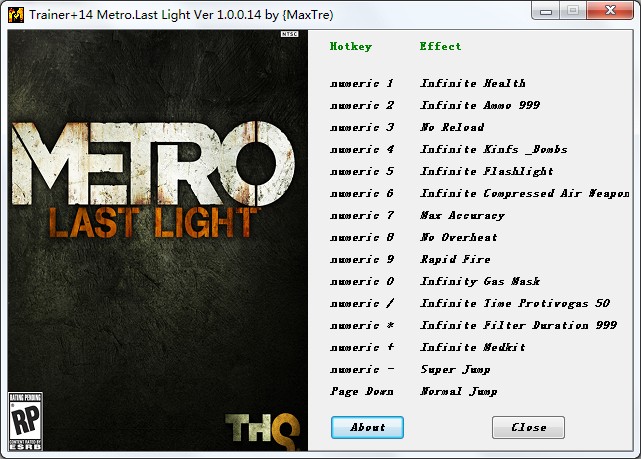 此款工具为游戏地铁:最后的曙光的修改器,对应游戏版本v1.0.0.14,提供十四项实用属性修改功能,下载后直接解压即可使用。