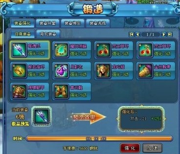 5.装备强化需要花费铜币,每次消耗铜币量及花费时间根据强化等级增高逐渐增加。