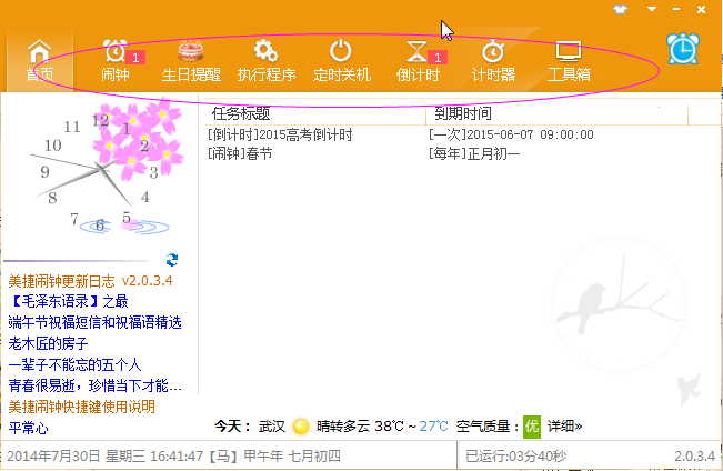 相信许多朋友在日常生活中都会用到闹钟,而在这给大家介绍一款多功能的电脑闹钟软件,为您提供定时闹钟、日常安排、定时执行程序、定时关机、倒计时、计时器、记事本等功能,使用快捷方便,操作简单,是您日常生活不可多得的好伙伴,绝对绿色实用!