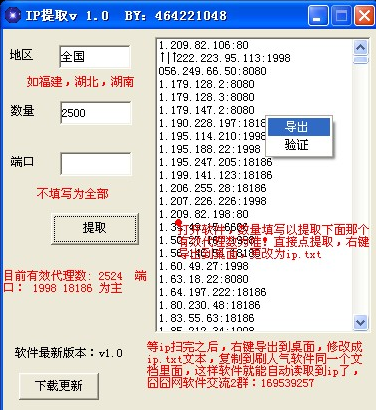 1、提取ip,填全国,数量一般填2500 ,以软件显示的有效ip为准,提取的速度很快,提取到了,右键导出到桌面,修改为ip.txt文本,然后把ip.txt文本拉到刷人气软件同一个文件夹里面。